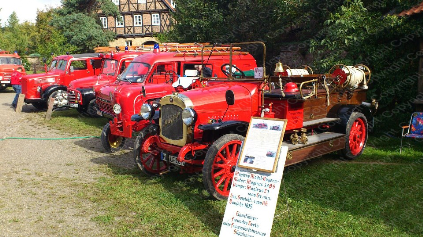 zu sehen v.l Henschel-Löschfahrzeug (LF 15) bei der Freiwilligen Feuerwehr Varel Baujahr 1955, der Ford Tanus und das LF10 von 1925